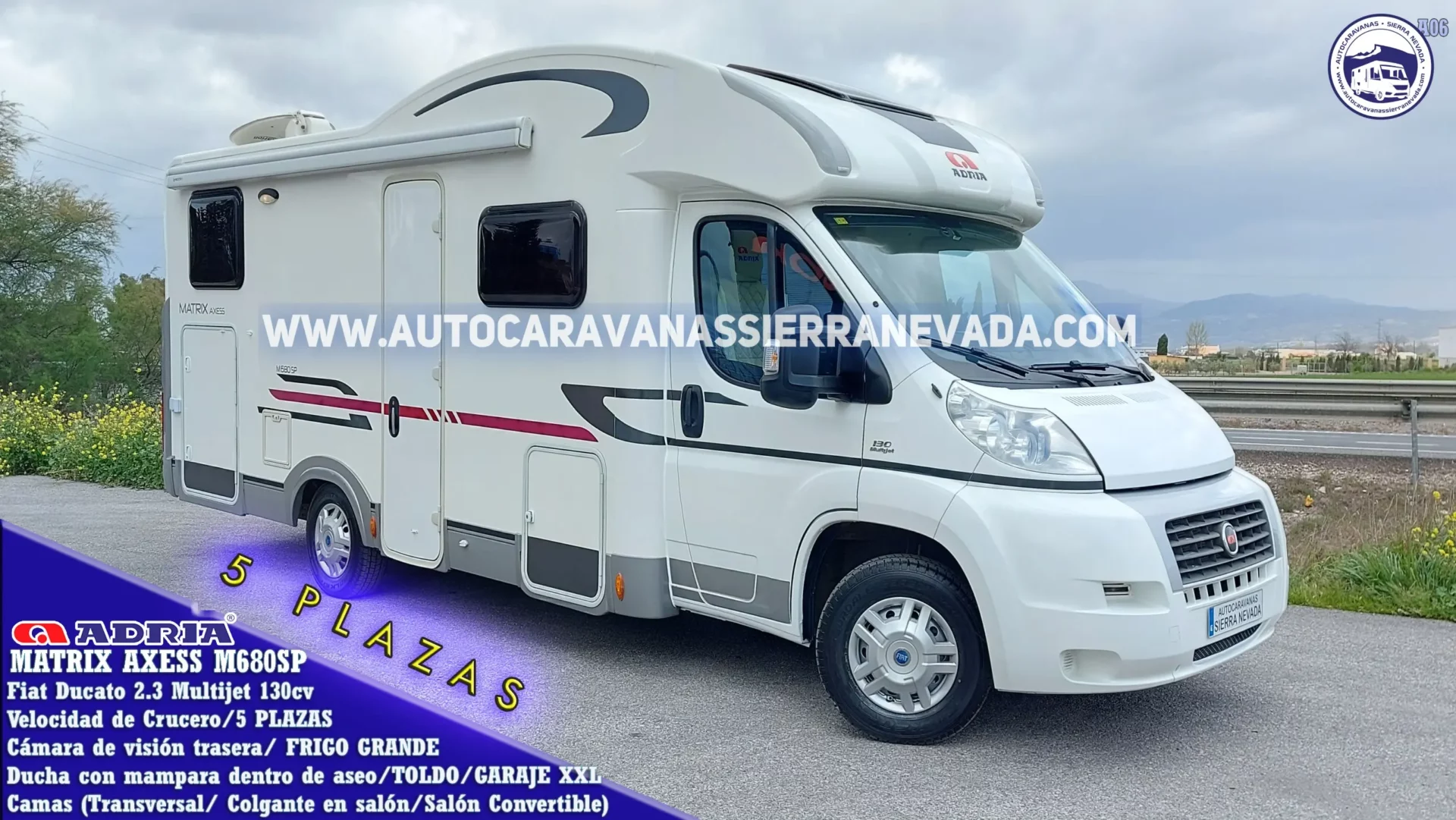 Autocaravana Perfilada ADRIA, modelo Matrix AXESS M680SP. Una marca Eslovena preparada para fríos extremos. Un vehículo muy aislado y de los más valorados por su estilo, rendimiento, comodidad, diseño y dureza en su construcción. Dispone de una claraboya panorámica en cabina muy amplia y una claraboya XXL en cocina por donde le entra mucha claridad dándole una sensación de amplitud y mucha ventilación Del año 2012, con 75.000km. Con un motor Fiat Ducato 2.3 Multijet 130cv y 6 velocidades un motor muy potente, fiable y de mantenimiento sencillo. Dispone de 5 plazas homologadas para viajar y dormir. *Cama Colgante en Salón,Salón Convertible y Transversal con acceso al garaje. Una autocaravana muy amplia, perfecta para familias ideal para hacer viajes de larga estancia y vivir en ella, Medidas: (7,40m x 2,80m). Garaje con doble portón XXL: (2,15m x 1,40m x 1,10m) donde podrá llevar bicicletas.