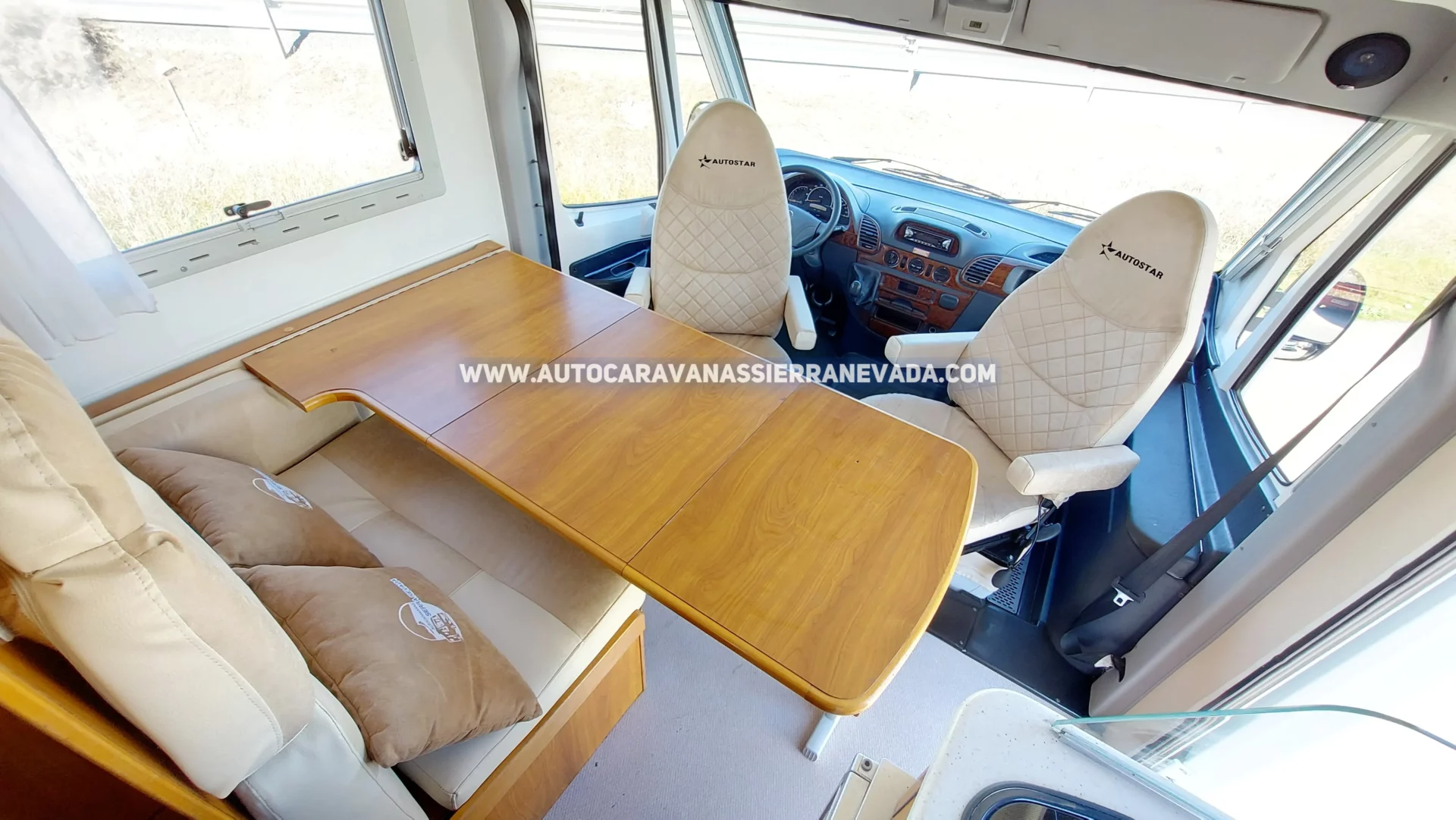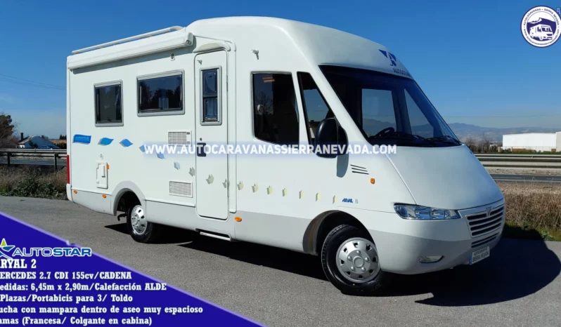 Autocaravana Integral AUTOSTAR, modelo ARYAL 2, una de las marcas de más calidad de Francia y especialistas en la fabricación de modelado Perfilado. Con un motor MERCEDES 2.7 CDI 155cv., super potente, robusto y fiable y lo mejor de todo con Cadena de distribución (no lleva correa).Del año 2003 y con 122.000km, procedente de particular. Homologada para viajar 4 personas y dormir. Dispone de dos camas doble: Colgante sobre cabina y Francesa en la parte trasera abatible con acceso a su amplio garaje, con unas medidas: (1,30m x 0,80m x 0,55m). Muy bien distribuido y amplia a pesar de no tener unas medidas excesivamente grandes, ideal  para gente que quiere una autocaravana muy cómoda de llevar y entrar en aparcamientos reducidos, se conduce igual que un turismo, Medidas: (6,45m x 2,90m). La calefacción y el agua caliente funcionan mediante la caldera ALDE, insonora y de radiadores como en casa.