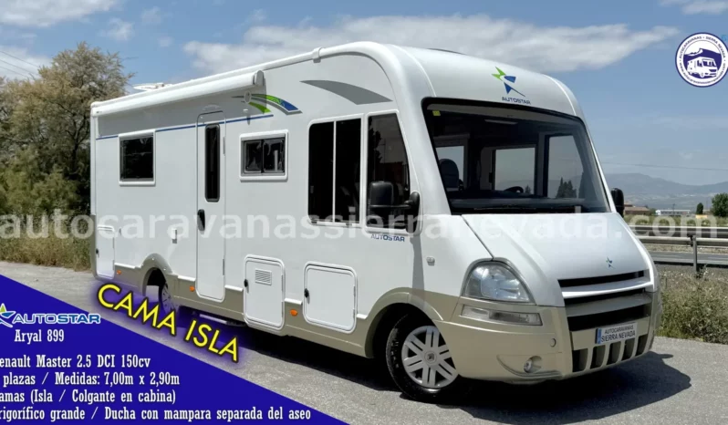 Autocaravana Integral AUTOSTAR, modelo ARYAL 899, una de las marcas de más calidad de Francia y especialistas en la fabricación de modelado integrales. Con motor Renault Master 2.5 DCI 150cv motor muy duro y de fácil mantenimiento y 6 velocidades, y lo mejor de todo, con Cadena de distribución. Del año 2009 y con 103.000km. Homologada para viajar y dormir 4 personas. Sus camas son: Colgante en Cabina doble y Cama Isla en la parte trasera, este tipo de cama también le proporciona una gran comodidad en todos los aspectos, tanto al hacerla como acostarse por ambos lados e incluso no molestar al otro al levantarse, además de conseguir un diseño muy selecto y cotizado en su interior. Dispone de un maletero doble portón con unas medidas: (2,20m x 0,85m x 0,85m). Muy bien distribuida y amplia en su interior a pesar de no tener unas medidas excesivamente grandes, ideal  para gente que quiere una autocaravana muy cómoda de llevar, Medidas: (7,00m x 2,90m).