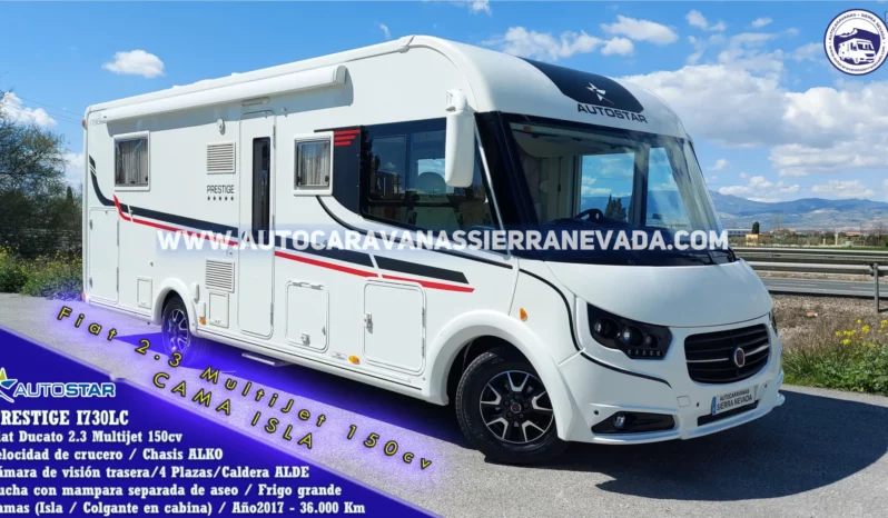 Autocaravana Integral AUTOSTAR, modelo PRESTIGE I730 LC, con unos excelentes acabados, diseños elegantes y gran calidad en sus muebles ,una de las marcas de más calidad de Francia y especialistas en la fabricación de modelado integrales, con unos acabados modernos y de altas calidades. Su diseño se caracteriza por el comedor FACE TO FACE espacioso y acogedor y su cama Isla, ideal para parejas, la facilidad y comodidad a la hora de hacerla y levantarse de ella, hace que sea el modelo de cama más demandado por nuestros clientes. Con un motor Fiat Ducato 2.3 MultiJet 150cv de 6 velocidades, un motor muy duro más que probado en este tipo de vehículos. Chasis ALKO con doble suelo y Suspensión con barras de torsión (mucho mejor que la suspensión de ballestas). Del año 2017 y con tan solo 36.000km, un vehículo con muy poco uso, muy cuidada y procedente de particular. Homologada para viajar y dormir 4 personas, gracias a sus camas; Isla (ya mencionada) y colgante sobre salón, ambas muy amplias. La calefacción y el agua caliente funcionan mediante la caldera ALDE, insonora y de radiadores como en casa. Con un garaje muy espacioso doble portón, sus medidas: (2,15m x 1,15m x 1,00m). Muy espaciosa en su interior, ideal para gente que quiere una autocaravana muy cómoda de llevar y entrar en aparcamientos reducidos, se conduce igual que un turismo, sus medidas: (7,40m x 3,00m).