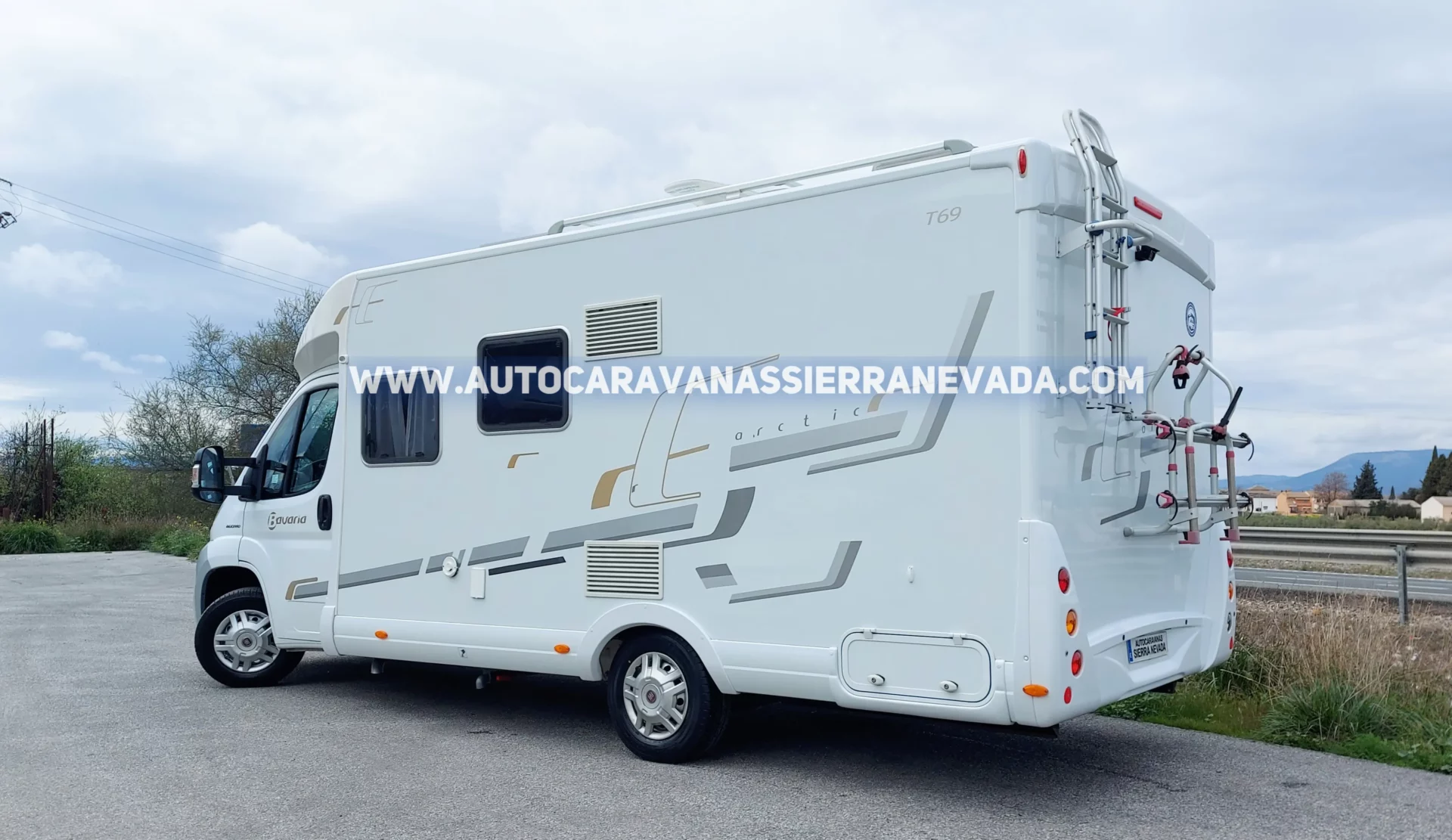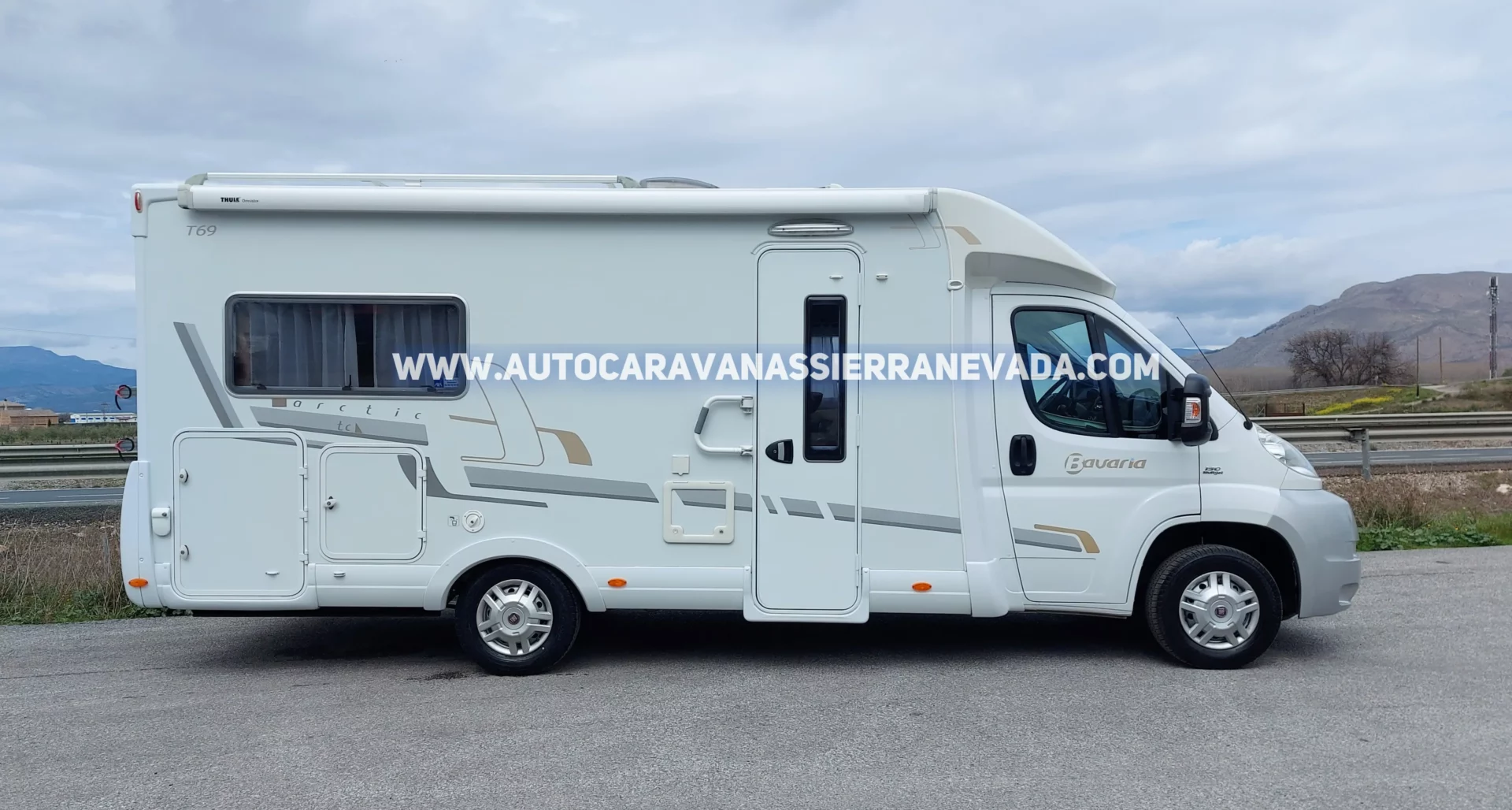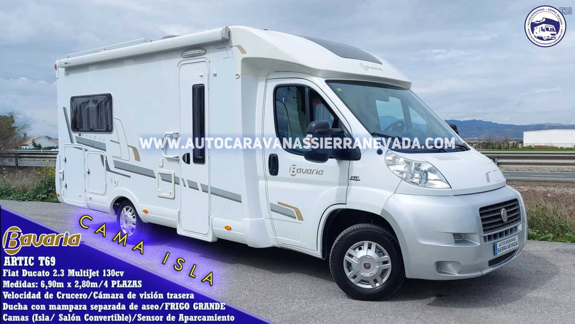 Autocaravana perfilada BAVARIA, modelo ARCTIC T69, Una de las mejores marcas del mercado. Autocaravana muy confortable, con muebles de madera de la mejor calidad, un vehículo de alta gama. Dispone de una claraboya XXL en cabina y salón muy amplias, por donde le entrara mucha claridad y dándole una sensación de amplitud y mucha ventilación. Del año 2013 y con tan solo 54.000km, procedente de particular. Con un Motor Fiat Ducato 2.3 MultiJet 130cv y seis velocidades, muy potente de fácil mantenimiento. Cuenta con 4 plazas homologadas para viajar y dormir gracias a sus siguientes camas: Isla con grandes huecos de almacenaje en la parte trasera, este tipo de cama le proporciona una gran comodidad en todos los aspectos, tanto al hacerla como acostarse por ambos lados y no molestar al otro al levantarse, además de conseguir un diseño muy selecto y cotizado en su interior y Salón Convertible. Dispone de un Garaje con doble portón, sus medidas: (2,25m x 0,90m x 0,90m). Muy bien distribuida a pesar de no tener unas medidas excesivamente grandes, ideal para gente que quiere una autocaravana muy cómoda de llevar, sus medidas: (6,90m x 2,80m).