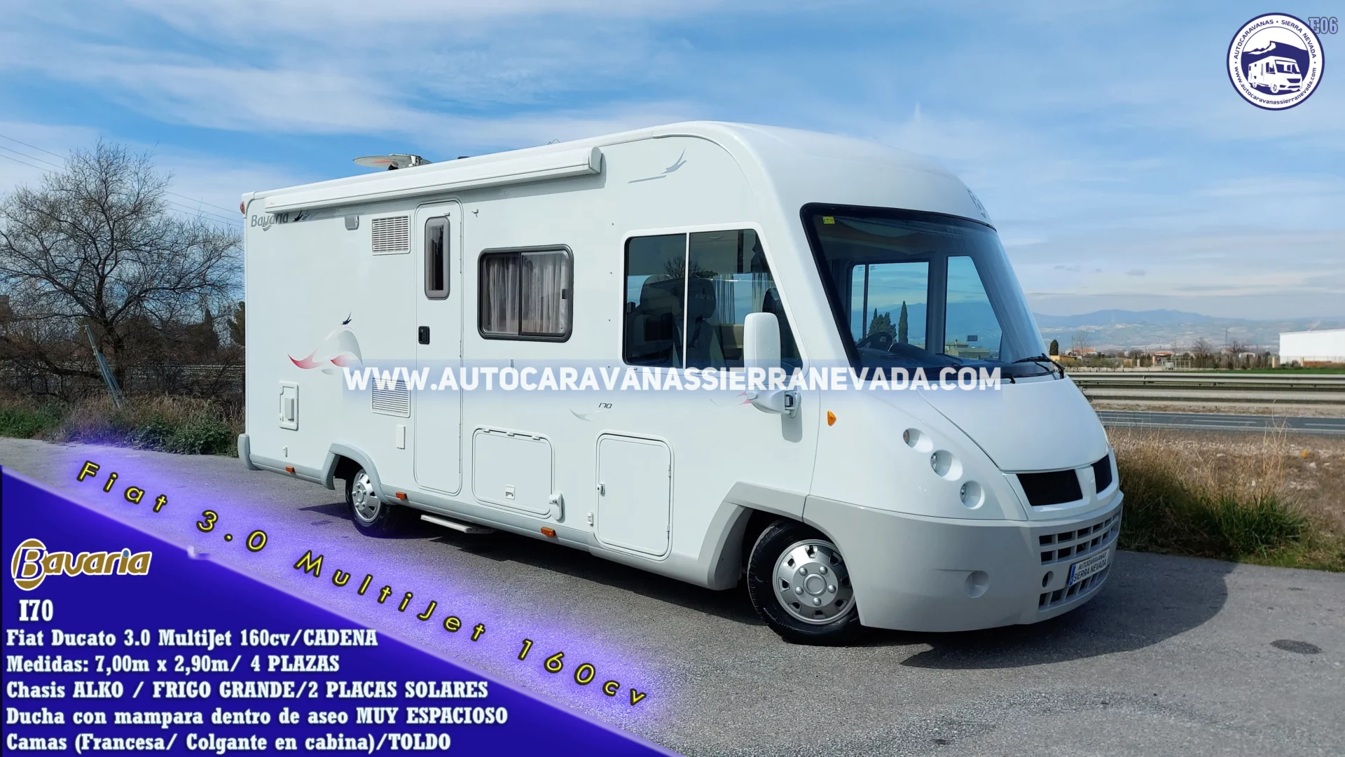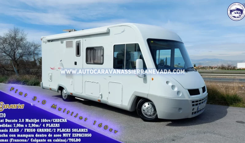 Autocaravana Integral de la marca, BAVARIA, modelo I70. Esta marca está situada en el mercado entre una de las mejores de Europa. Tiene una línea muy actual, ambiente acogedor, con unos acabados y muebles de alta calidad. Año 2008 y con tan solo 91.000km y toda su documentación que los certifican. Motor Fiat Ducato 3.0 MultiJet 160cv 6 velocidades y con CADENA DE DISTRIBUCIÓN, muy duro, potente y de fácil mantenimiento. Con Chasis ALKO con doble suelo y *Suspensión con barras de torsión (mucho mejor que la suspensión de ballestas). Con 4 plazas homologadas para viajar y dormir gracias a su Cama colgante doble sobre cabina y Francesa en la parte trasera con acceso al garaje. Dispone muy espacioso con unas medidas: (2,24m x 2,00m x 0,85m). Una autocaravana espaciosa en su interior a pesar de no tener unas medidas excesivamente grandes, perfecta para familias e ideal para gente que quiere una autocaravana muy cómoda de llevar y entrar en aparcamientos reducidos, se conduce igual que un turismo: (7,00m x 2,90m).