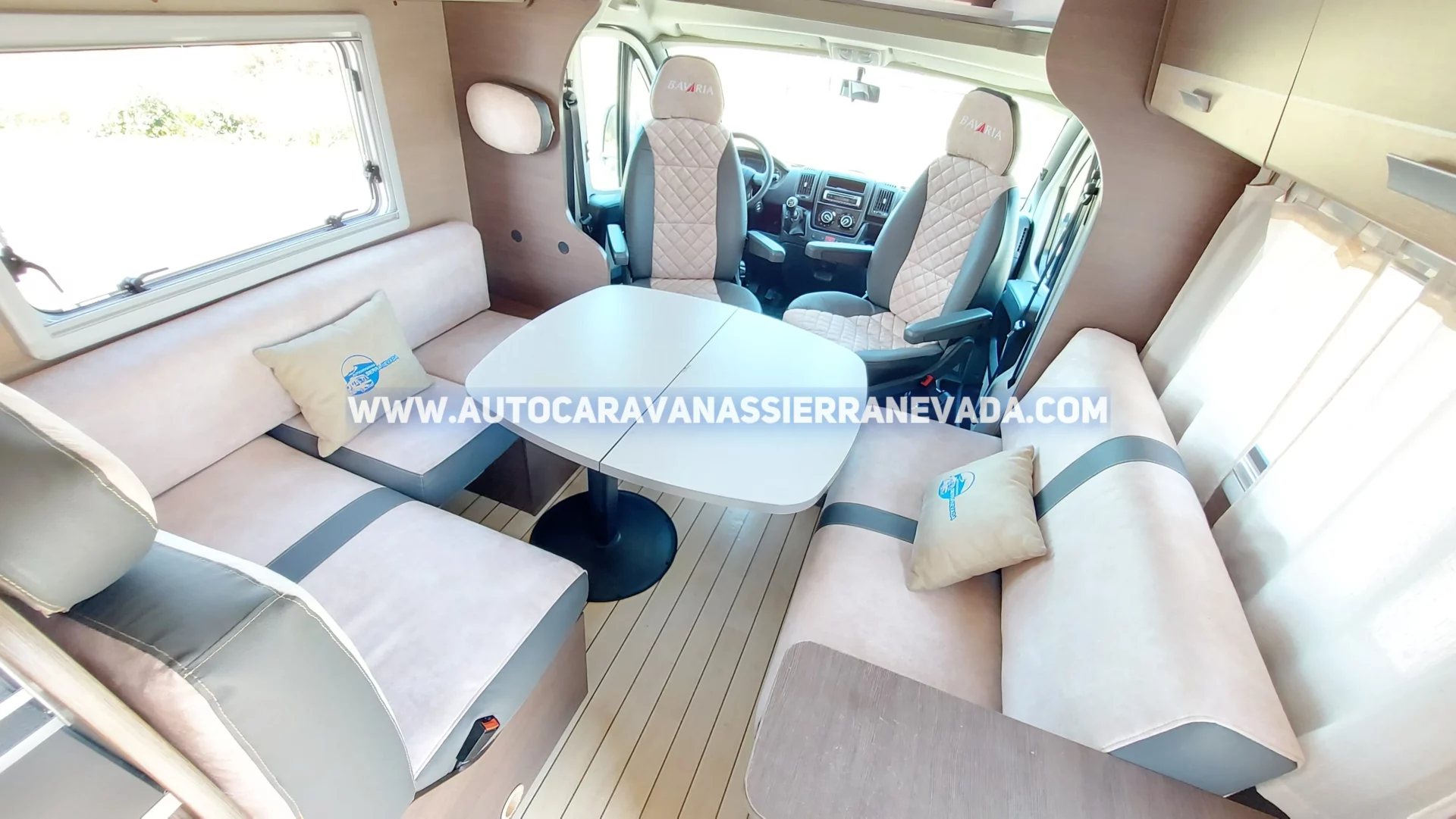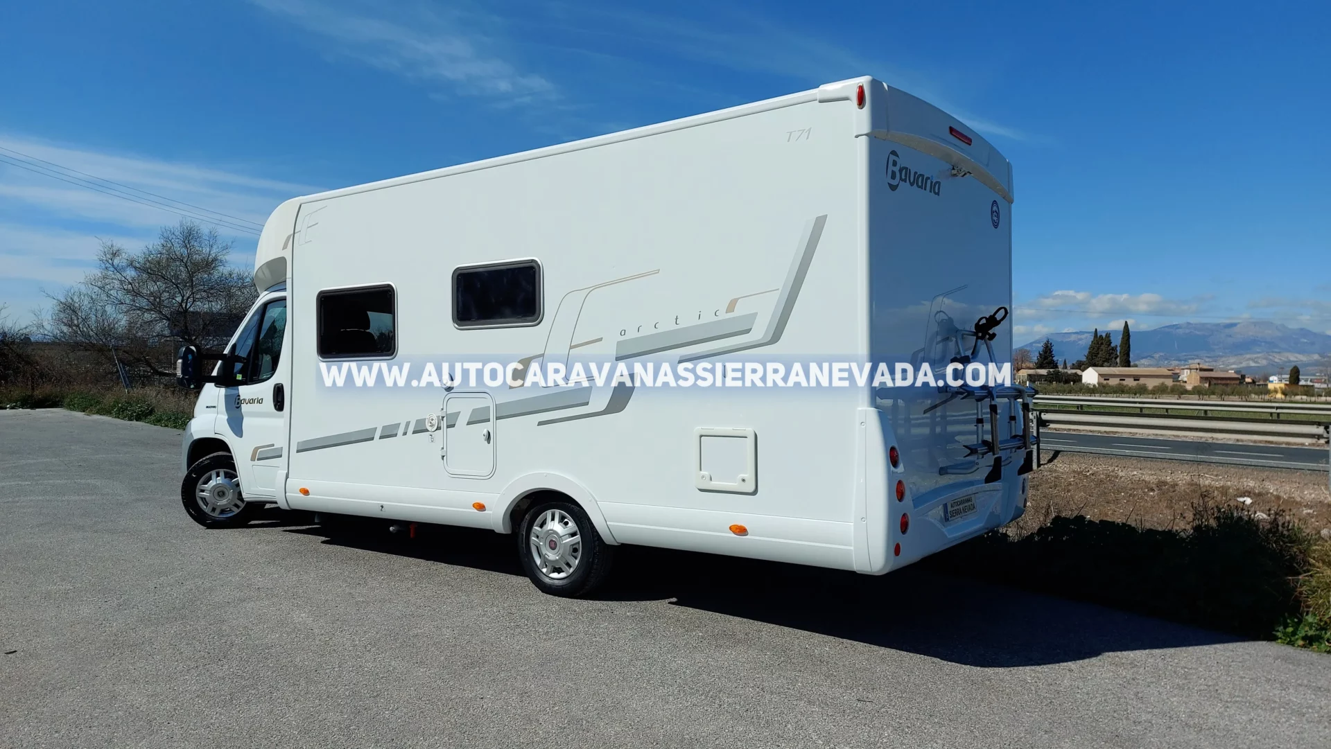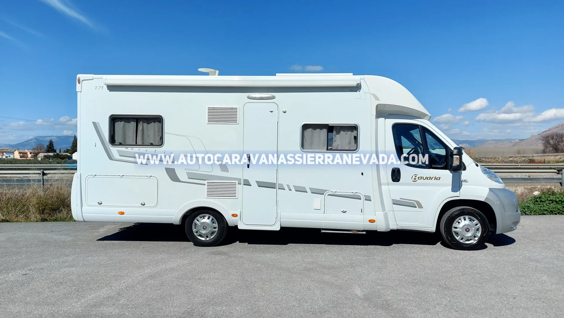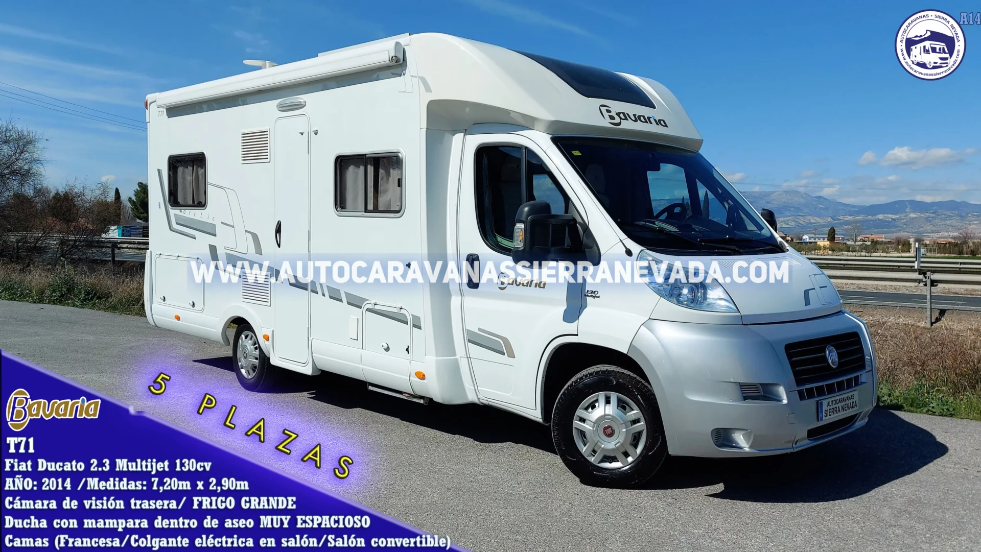 Autocaravana perfilada BAVARIA, modelo T71, Una de las mejores marcas del mercado. Autocaravana muy confortable, con muebles de madera de la mejor calidad, un vehículo de alta gama. Dispone de una claraboya XXL en la cabina muy amplia, por donde le entrara mucha claridad y dándole una sensación de amplitud y mucha ventilación. Del año 2013 y con tan solo 73.000km, muy cuidada procedente de particular. Con un Motor Fiat Ducato 2.3 MultiJet 130cv y seis velocidades, muy potente  de fácil mantenimiento. Cuenta con 5 plazas homologadas para viajar gracias a sus siguientes camas: Francesa con acceso al garaje, Salón Convertible y Cama colgante electrica sobre el salón. Dispone de un amplio con unas medidas: (1,20m x 1,60m x 0,70m). Una autocaravana muy amplia, perfecta para hacer viajes de larga estancia y vivir en ella, Medidas: (7,20m x 2,90m).