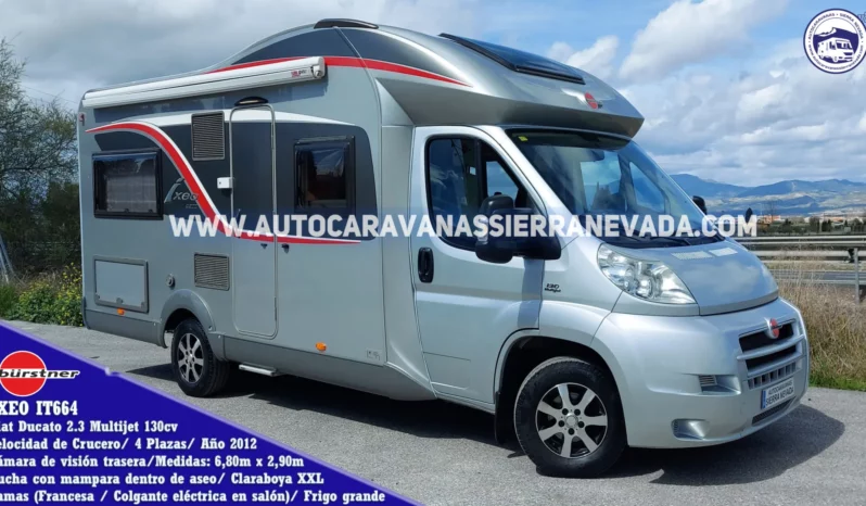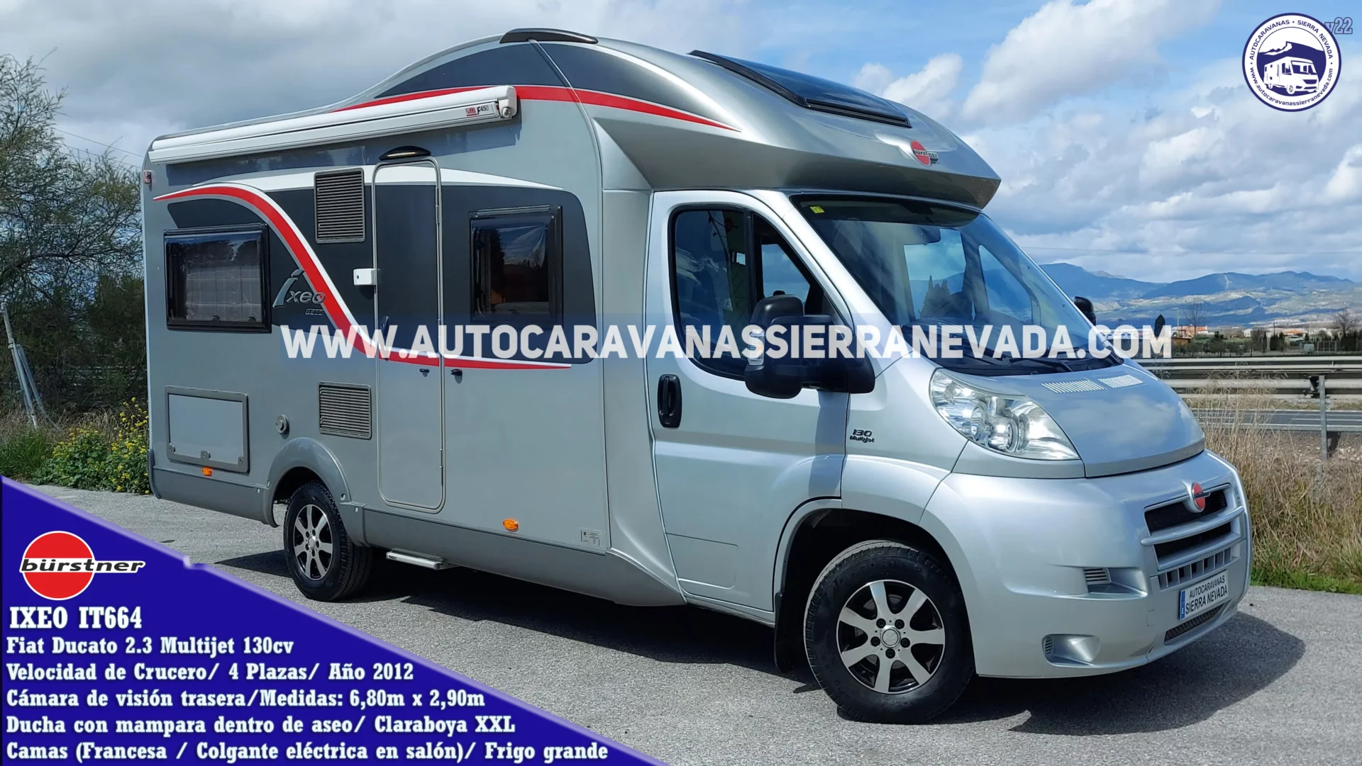 Autocaravana perfilada de la prestigiosa y mejor marca del mercado BURSTNER, modelo Ixeo IT 664. Esta marca aporta un diseño tanto interior como exterior muy actual, con terminaciones y acabados de la máxima calidad. Con 82.000km., todas sus revisiones y documentación que los certifican. Año 2012 y con motor Fiat Ducato 2.3 MultiJet 130cv, muy potente y con mucha fuerza, consiguiendo una gran velocidad punta haciendo poco consumo gracias a su bajo cubicaje y sus 6 velocidades. Con 4 plazas para viajar y dormir, con Cama FRANCESA abatible para acceder al maletero desde el interior y cama colgante sobre el salón. Dispone de un gran garaje, sus medidas son: (1,25m x 1,20m x 0,45m). Un vehículo ideal para gente que quiere una autocaravana muy cómoda de llevar y entrar en aparcamientos reducidos, se conduce igual que un turismo, medidas:(6,80m x 2,90m).