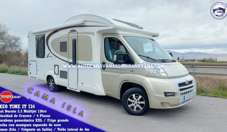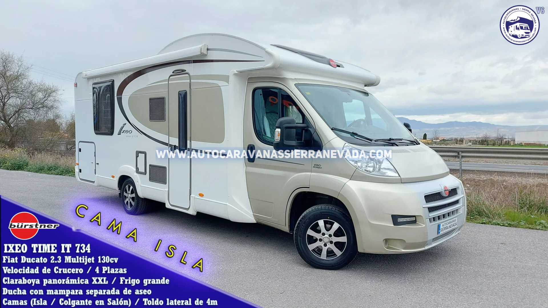 Autocaravana perfilada de la prestigiosa y mejor marca del mercado BURSTNER modelo Ixeo TIME IT 734. Esta marca aporta un diseño tanto interior como exterior muy actual, con terminaciones y acabados de la máxima calidad, en perfiladas. Con 66.000km, con documentación que los certifican. Año 2013 y con motor Fiat Ducato 2.3 MultiJet 130cv, muy potente y con mucha fuerza. Dispone de una claraboya XXL en la cabina muy amplia, por donde le entrara mucha claridad y dándole una sensación de amplitud y mucha ventilación. Con 4 plazas para viajar y dormir, Cama Colgante en salón para dos personas y Cama Isla con grandes huecos de almacenaje, uno de los modelo más selecto, ideal para parejas, la facilidad y comodidad a la hora de hacerla y levantarse de ella, hace que sea el modelo de cama más demandado por nuestros clientes. Dispone de un gran garaje muy espacioso con unas medidas: (1,80m x 0,95m x 0,80m). Cuenta con una distribución muy amplia, moderna y espaciosa gracias a sus medidas:(7,40m x 2,80m) ideal para vivir en ella y hacer grandes viajes. Se conduce con carnet B, el normal.