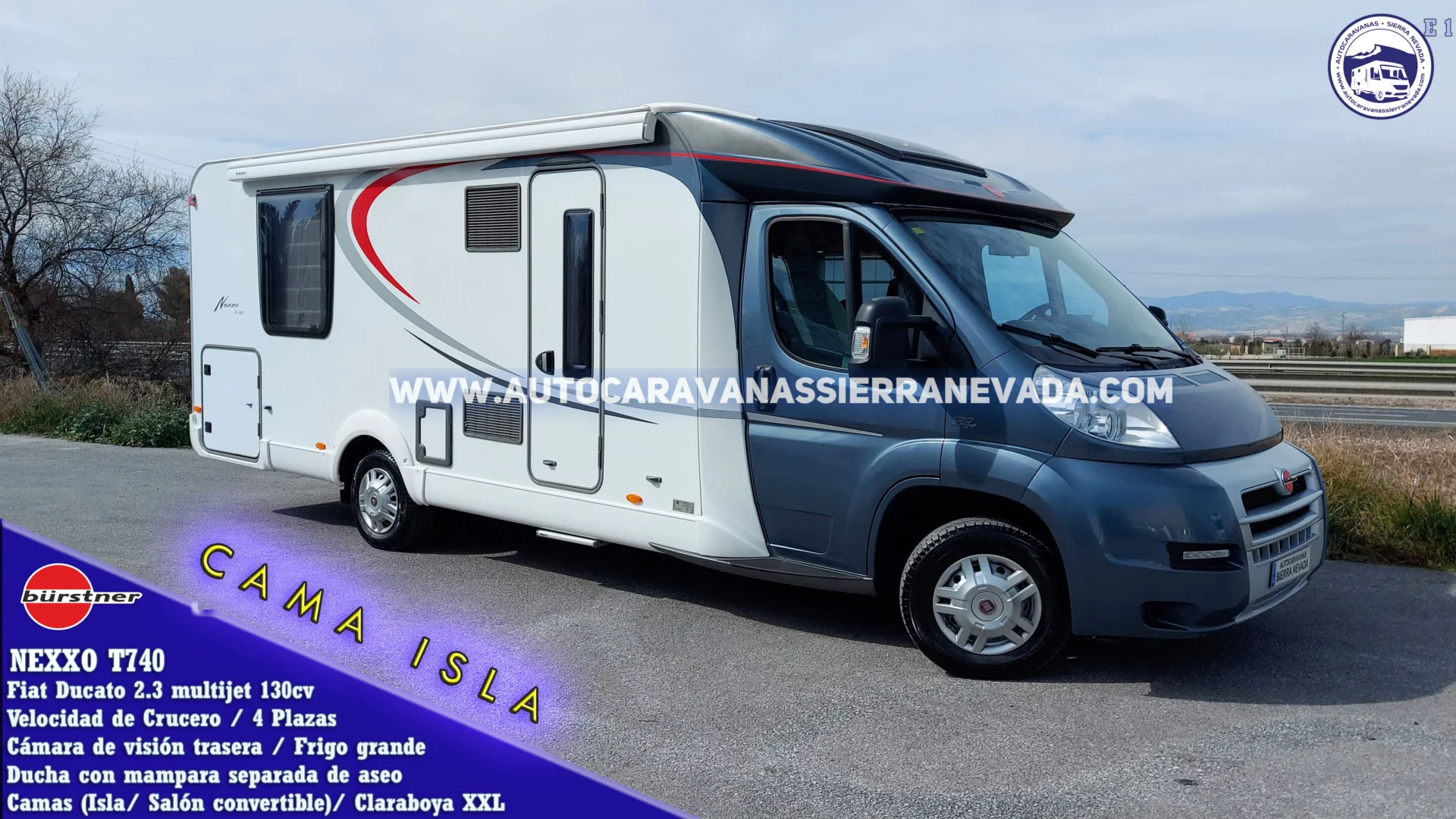 Autocaravana Integral BURSTNER, modelo NEXXO T 740. Esta prestigiosa marca aporta un diseño tanto interior como exterior muy actual, con terminaciones y acabados de la máxima calidad y actuales. Con un motor Fiat Ducato 2.3 MultiJet 130cv y 6 velocidades, muy potente, de fácil. Del año 2013 con 84.000km. Homologada con 4 plazas para viajar y dormir, gracias a sus 2 camas dobles: Cama Isla, este tipo de cama le proporciona una gran comodidad en todos los aspectos, tanto al hacerla como acostarse por ambos lados e incluso no molestar al otro al levantarse, además de conseguir un diseño muy selecto y cotizado en su interior y Salón convertible. Dispone de un amplio maletero con unas medidas: (2,15m x 0,95m x 0,80m). Cuenta con una amplia distribución gracias a sus medidas exteriores: (7,40m x 2,80m) perfecta para hacer largos viajes e incluso vivir en ella.