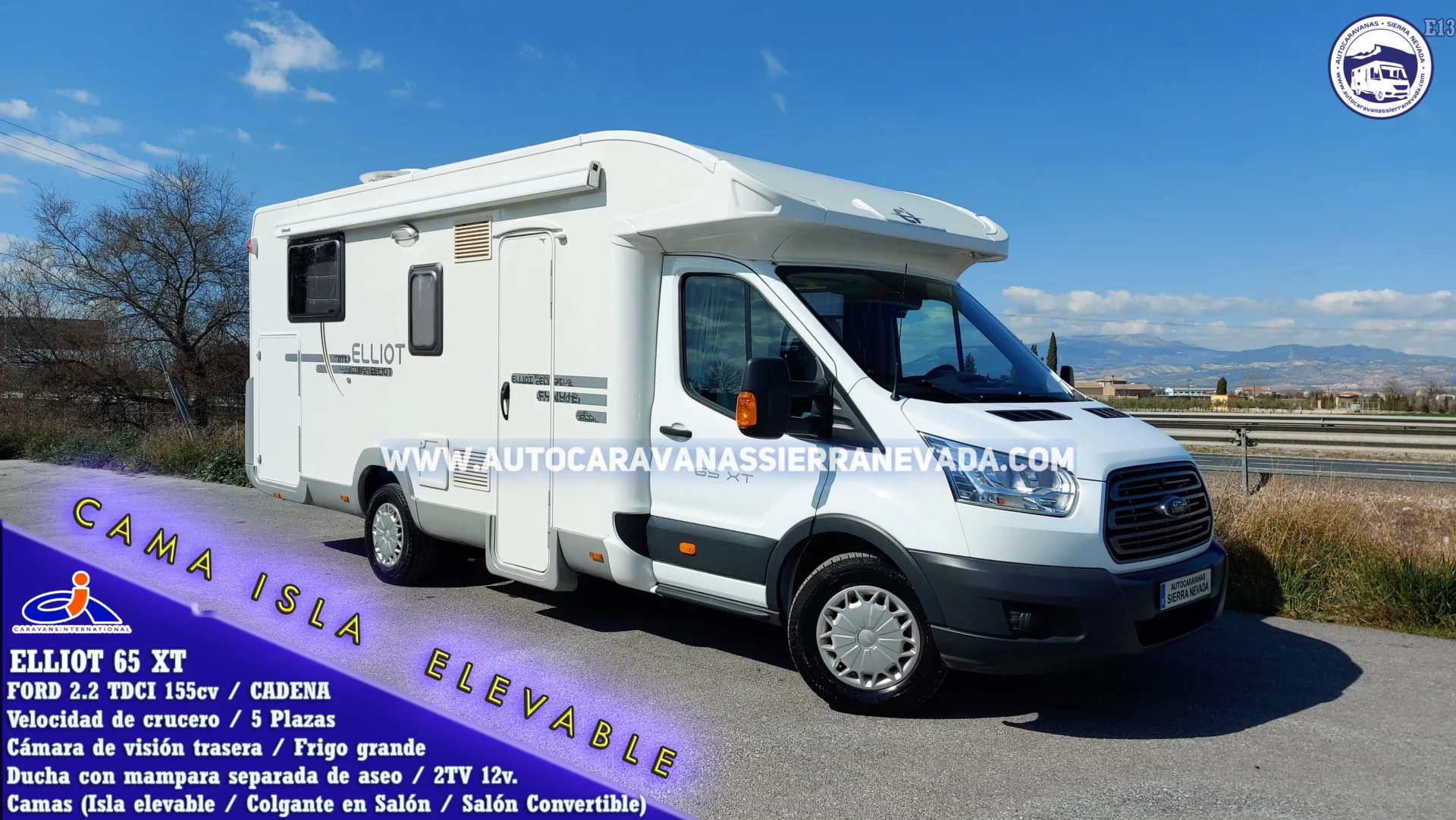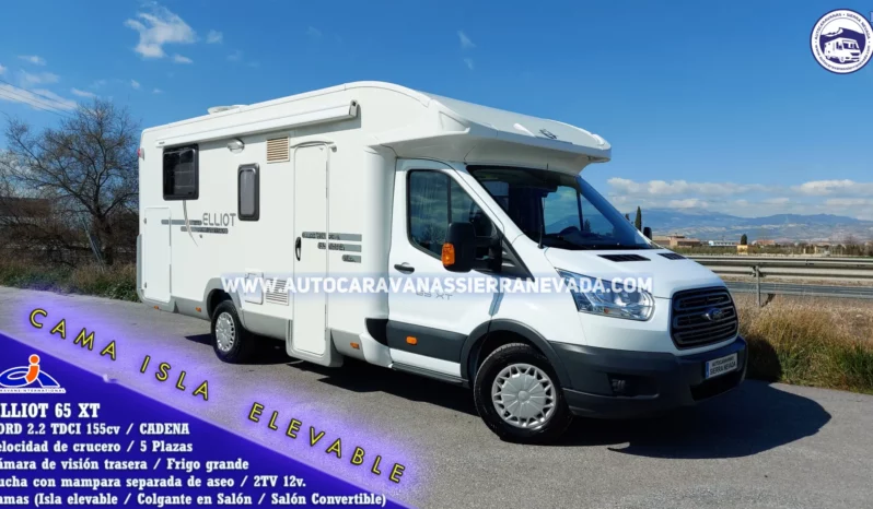 Autocaravana Perfilada CARAVANS INTERNATIONAL, modelo ELLIOT 65 XT. Los interiores están diseñados con la funcionalidad en mente. Soluciones que responden a las necesidades del día a día y permiten disfrutar de cada espacio de la manera más cómoda y fácil. Ambientes que se transforman mediante sencillos gestos y ofrecen un servicio diferente, pero adecuado a las diversas exigencias de cada momento. Con Motor FORD 2.2 TDCI 155cv / y seis velocidades un motor muy potente, duro y robusto, de bajo consumo y lo mejor de todo, con CADENA de distribución. Del año 2015 con tan solo 56.000km.Dispone de 5 plazas homologadas en documentación para viajar y dormir gracias a sus camas: Cama Isla elevable. Uno de los modelo más selecto, ideal para parejas, la facilidad y comodidad a la hora de hacerla y levantarse de ella, hace que sea el modelo de cama más demandado por nuestros clientes, Colgante en Salón+ Salón Convertible para una persona .Muy bien distribuida y espaciosa en su interior, perfecta para largos viajes, con unas medidas exteriores:(7,50m x 2,90). Dispone de un maletero doble portón con unas medidas: (2,15m x 1,05m x 1,20m).