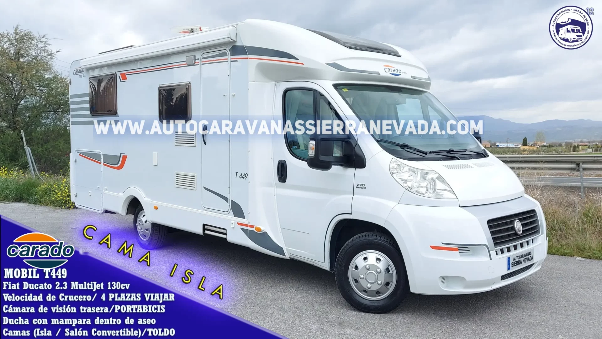 Autocaravana Perfilada CARADO, modelo MOBIL T449, perteneciendo al grupo HYMER una de las mejores marcas del mercado con acabados de gran calidad y de construcción Alemana. De las mejores marcas en Europa. Dispone de una claraboya panorámica por donde entra mucha claridad dándole una sensación de amplitud y mucha ventilación. Con un motor muy actual, Fiat Ducato 2.3 MultiJet con 130cv y 6 Velocidades, súper potente, robusto y fiable. Con 86.000km. Del año 2010 y con 4 plazas homologadas para viajar y 3 dormir. Dispone de Cama isla con grandes huecos de almacenaje, este tipo de cama también le proporciona una gran comodidad en todos los aspectos, tanto al hacerla como acostarse por ambos lados e incluso no molestar al otro al levantarse, además de conseguir un diseño muy selecto y cotizado en su interior y Salón Convertible para 1. Con un amplio garaje doble portón: (2,20m x 1,20m x 1,00m). Una autocaravana muy amplia en la que podrá hacer grandes viajes incluso vivir en ella gracias a sus medidas:(7,20m x 2,95m). NOTA INFORMATIVA: A petición del cliente se puede hacer una pequeña modificación en salón para dormir otra persona mas(no entra en el presupuesto del vehículo)