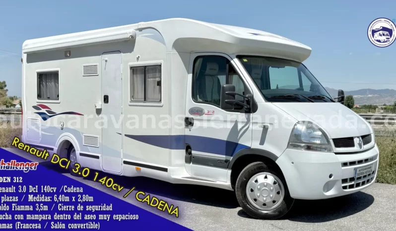 Autocaravana Perfilada CHALLENGER, modelo EDEN 312. Una marca muy apreciada en el mercado por su calidad, estética y diseño. Del año 2006 y con 136.000km. Motor Renault 3.0 dci 140cv, muy duro y de fácil mantenimiento, con cadena de distribución. Con 5 plazas homologadas para viajar y 4 para dormir gracias a camas: Francesa en la parte trasera y salón convertible. Un vehículo muy bien distribuido y espacioso a pesar de no tener unas medidas excesivamente grandes, ideal para gente que quiere una autocaravana muy cómoda de llevar y entrar en aparcamientos reducidos, se conduce igual que un turismo. Sus medidas son;(6,40m x 2,80m). Dispone de un maletero al que accedemos desde el exterior o levantando la cama francesa, sus medidas:(1,30m x 0,95m x 0,55m).