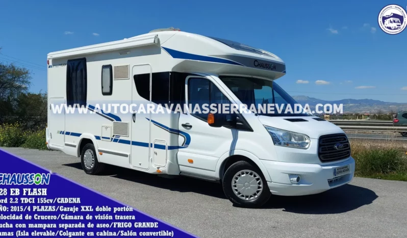 Autocaravana Perfilada de la marca Chausson, modelo 628 EB FLASH. Una de las marcas más valoradas por su dureza en su construcción, durabilidad, comodidad y seguridad. Con un diseño moderno y elegante. Dispone de una claraboya panorámica en cabina muy amplia y otra Claraboya XXL en la cocina, por donde le entra mucha claridad dándole una sensación de amplitud y mucha ventilación. Del año 2015 con tan solo 85.000 km, prácticamente a estrenar, procedente de particular. Con motor, Ford 2.2 TDCI 155cv con Cadena de distribución, muy duro, potente y de fácil mantenimiento. Con 4 plazas homologadas en documentación para viajar y dormir gracias a sus siguientes camas: Colgante en salón e Isla elevable, este tipo de cama leproporciona una gran comodidad en todos los aspectos, tanto al hacerla como acostarse por ambos lados e incluso no molestar al otro al levantarse, además de conseguir un diseño muy selecto y cotizado en su interior. Dispone de un garaje con unas medidas: (2,15 largo x 0,90 ancho x 1,20 alto). Ideal para gente que quiere una autocaravana muy cómoda de llevar y entrar en aparcamientos reducidos, se conduce igual que un turismo, Medidas: (7,00m x 3,00m).