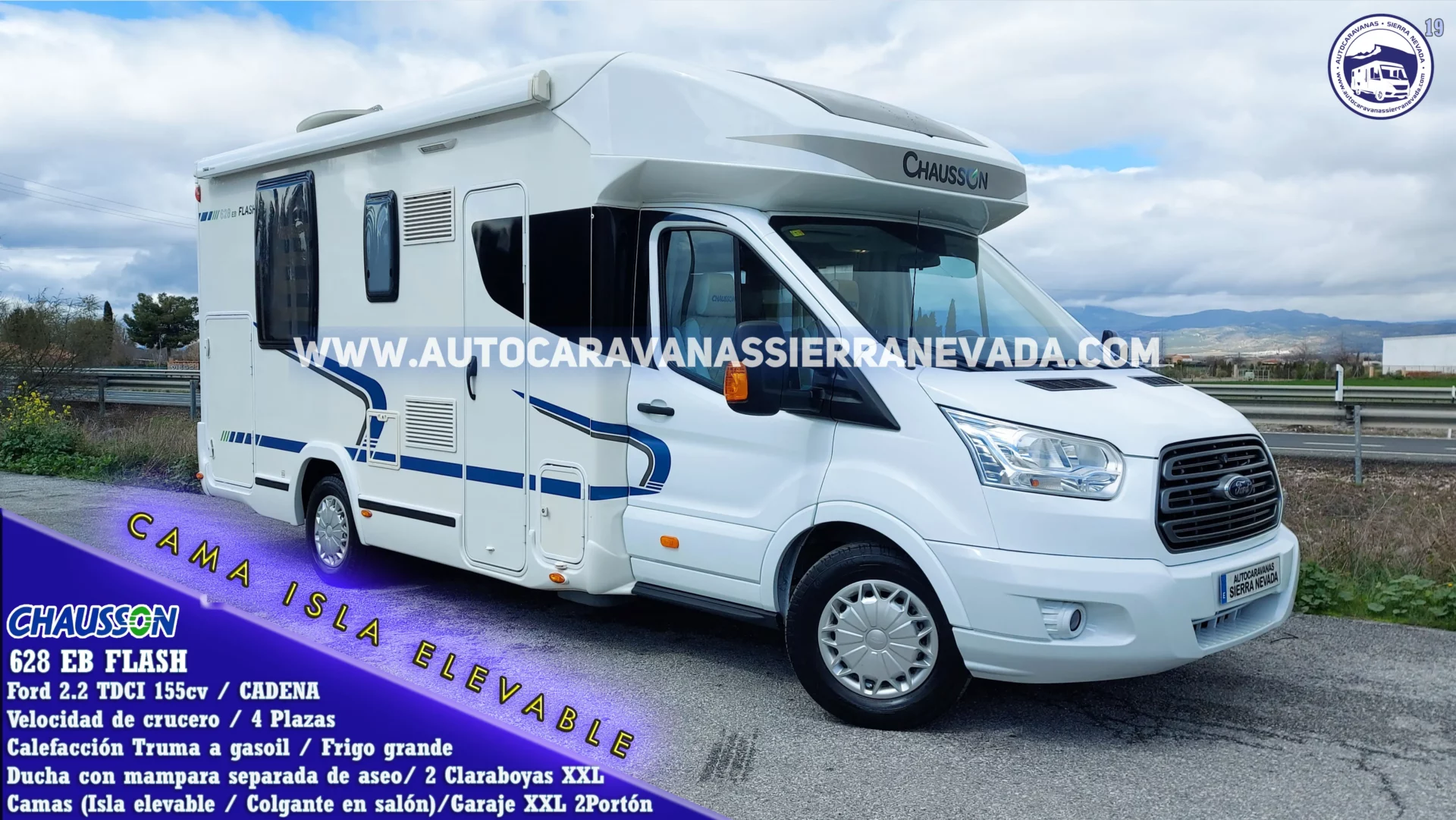 Autocaravana Perfilada de la marca Chausson, modelo 628 EB FLASH. Una de las marcas más valoradas por su dureza en su construcción, durabilidad, comodidad y seguridad. Con un diseño moderno y elegante. Dispone de una claraboya panorámica en cabina muy amplia y otra Claraboya XXL en la cocina, por donde le entra mucha claridad dándole una sensación de amplitud y mucha ventilación. Del año 2014 con tan solo 54.000 km, prácticamente a estrenar, procedente de particular. Con motor, Ford 2.2 TDCI 155cv con Cadena de distribución, muy duro, potente y de fácil mantenimiento. Con 4 plazas homologadas en documentación para viajar y dormir gracias a sus siguientes camas: Colgante en salón e Isla elevable, este tipo de cama le proporciona una gran comodidad en todos los aspectos, tanto al hacerla como acostarse por ambos lados e incluso no molestar al otro al levantarse, además de conseguir un diseño muy selecto y cotizado en su interior. Dispone de un garaje con unas medidas: (2,15 largo x 0,90 ancho x 1,25 alto). Ideal para gente que quiere una autocaravana muy cómoda de llevar y entrar en aparcamientos reducidos, se conduce igual que un turismo, Medidas: (7,00m x 3,00m).