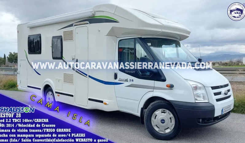 Autocaravana Perfilada de la marca Chausson, modelo BESTOF 28. Una de las marcas más valoradas por su dureza en su construcción, durabilidad, comodidad y seguridad. Con un diseño moderno y elegante. Dispone de una claraboya panorámica en cabina muy amplia, por donde le entra mucha claridad dándole una sensación de amplitud y mucha ventilación. Del año 2014 con tan solo 53.000km, procedente de particular. Con motor, Ford 2.2 TDCI 140cv con Cadena de distribución, muy duro, potente y de fácil mantenimiento. Consta de un boiler TRUMA + calefacción para agua caliente de gasoil WEBASTO. Con 4 plazas homologadas en documentación para viajar y dormir gracias a sus siguientes camas: Salon convertible y Isla, este tipo de cama le proporciona una gran comodidad en todos los aspectos, tanto al hacerla como acostarse por ambos lados e incluso no molestar al otro al levantarse, además de conseguir un diseño muy selecto y cotizado en su interior. Dispone de un garaje doble portón, con unas medidas: (2,15 largo x 0,80 ancho x 0,80 alto). Ideal para gente que quiere una autocaravana muy cómoda de llevar y entrar en aparcamientos reducidos, se conduce igual que un turismo Muy amplia en su interior gracias a sus medidas,: (7,20m x 2,90m).