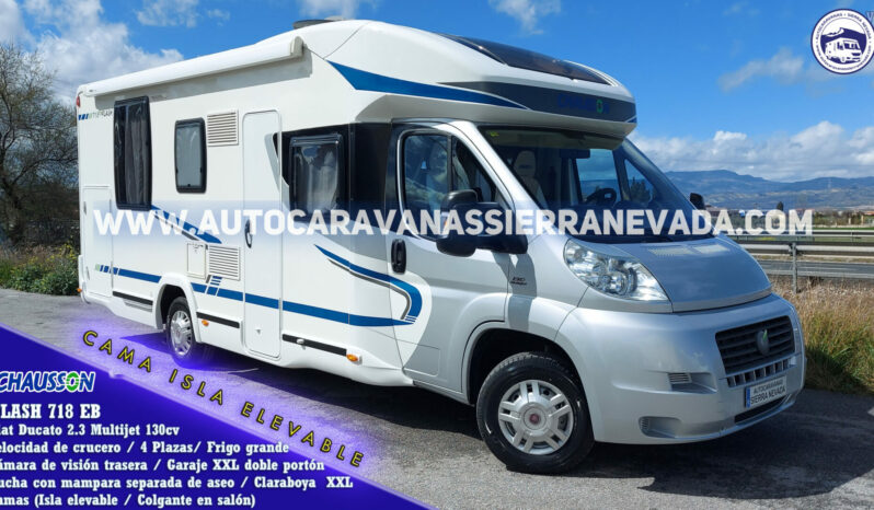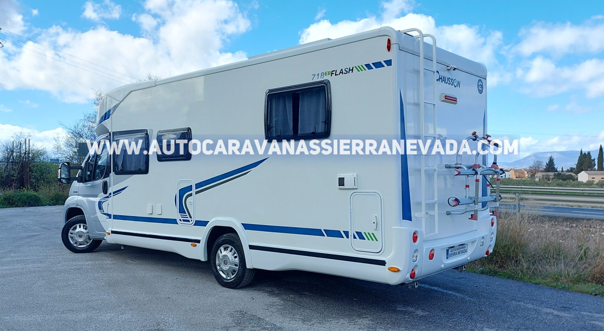 Autocaravana Perfilada CHAUSSON, modelo FLASH 718 EB un modelo exclusivo, de muy alta gama y con unos materiales y acabados dignos de este modelo .Una de las marcas más valoradas del mercado. Muy cuidada. Dispone de una claraboya panorámica en cabina muy amplia, por donde le entra mucha claridad dándole una sensación de amplitud y mucha ventilación. Con un motor Fiat Ducato 2.3 MultiJet 130cv / 6 Velocidades, muy potente, duro, robusto y de bajo consumo. Del año 2014 con tan solo 21.000km, procedente de particular, no proviene de alquiler, mucho mejor que comprarla nueva ya que el impuesto de matriculación (muy elevado) y el IVA está incluido en este precio. Dispone de 4 plazas homologadas en documentación para viajar y dormir. Sus camas: Cama Isla elevable en la parte trasera con acceso a maletero, por lo cual nos  permitirá meter bicicletas y motos, en su punto más elevado. Uno de los modelo más selecto, ideal para parejas, la facilidad y comodidad a la hora de hacerla y levantarse de ella, hace que sea el modelo de cama más demandado por nuestros clientes + Colgante en salón. Muy espaciosa en su interior debido a sus medidas exteriores: (7,50m x 2,90m) perfecta para hacer largos viajes o vivir en ella. Con un Maletero Trasero doble portón XXL: (2,20m x 0,90m x 1,20m), donde podrá llevar bicicletas o moto scooter.