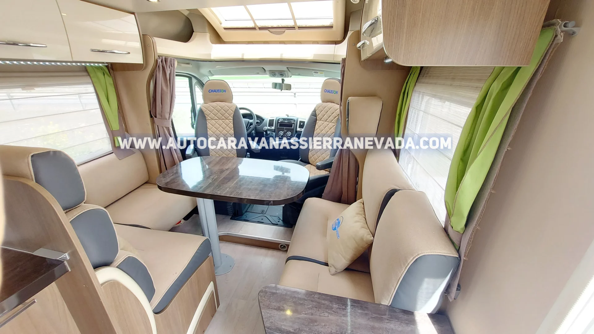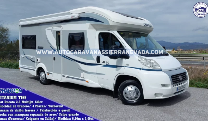 Autocaravana Perfilada CHAUSSON modelo TITANIUM TI69, de las marcas más valoradas del mercado con grandes acabados de calidad y durabilidad. Se encuentra en un estado de conservación perfecto, extremadamente cuidada, procedente de particular. Dispone de una claraboya panorámica XXL en cabina muy amplia, por donde le entra mucha claridad dándole una sensación de amplitud y mucha ventilación. Consta de un TurboVent automático con mando a distancia en el dormitorio. Calefacción y agua caliente TRUMA Combi a gasoil. Del año 2013 y con tan solo 68.000km y con toda la documentación que los certifica. Un motor Fiat Ducato 2.3 MultiJet 130cv motor muy duro y de fácil mantenimiento. Una autocaravana grande muy bien distribuida y amplia en su interior perfecta para hacer largos viajes y vivir en ella, sus medidas son: (6,70m x 3,00m). Homologada para viajar 5 personas y 4 dormir, con 2 camas: (Colgante en salón y cama Francesa  en la parte trasera. Garaje con medidas: (1,40m x 1,20m x 0,50m).