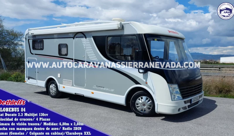 Autocaravana Integral DETHLEFFS, modelo GLOBEBUS 84. Calidad “Made in Germany” Una construcción alemana con una buena distribución, gran calidad en sus materiales y excelentes acabados dignos de esta marca. Con un motor Fiat Ducato 2.3 Multijet 130cv, un motor muy fiable y de mantenimiento sencillo. Año 2011 con tan solo 73.000km, con muy poco uso, muy cuidada, procedente de particular. Homologada con 4 plazas para viajar y dormir gracias a sus camas: Dos camas gemelas muy amplias y convertibles en Transversal gigante en la parte trasera con grandes huecos de almacenaje y Cama Colgate en cabina. Dispone de un maletero amplio con doble portón, sus medidas: (2,00m x 0,85m x 1,10m). Autocaravana super espaciosa, ideal para usar como vivienda o viajes largos Medidas: (6,80m x 2,80m).