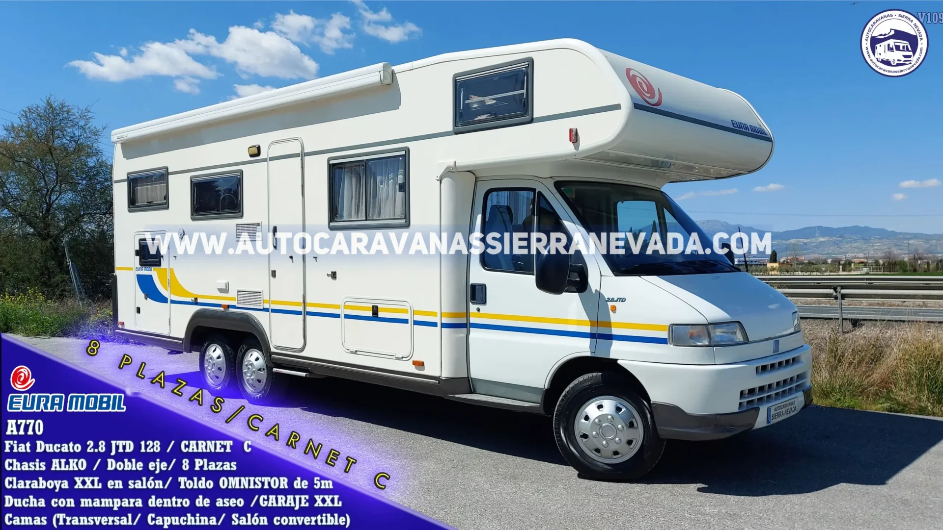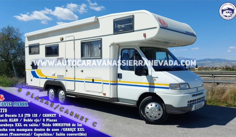 Autocaravana Capuchina EURA MOBIL, modelo A770. La marca más valorada de Europa por su diseño y dureza en su construcción. Del año 2001 procedente de único propietario y con 178.000km hechos en autopista. MotorFiat Ducato 2.8 JTD 128cv un motor muy duro y con posibilidad de hacer muchísimos kilómetros más. Montada sobre CHASIS ALKO, con suspensión con barras de torsión, (mucho mejor que la suspensión de ballestas). Ventajas de su doble eje trasero y su Chasis Alko: proporciona una gran estabilidad, mejor reparto de peso, más freno y la seguridad ante un incidente como el reventón de una rueda. Es una autentica casa con ruedas, con un espectacular salón muy espacioso y super cómodo, igualmente su concina extra grande, perfecta para vivir en ella por su gran longitud. Se conduce con carnet C, y su M.M.A 5.000kg la mayor ventaja es su capacidad de carga. Un vehículo muy cotizado ya que hay muy pocas autocaravanas con 8 plazas homologadas para viajar y dormir, gracias a sus dos camas doble *Transversal en la parte trasera + Capuchina + Salón convertible. Muy amplia y alta siendo perfecta para gente alta o con necesidad de mucha amplitud, perfecta para hacer largos viajes incluso vivir en ella. Medidas: (7,80m x3,20m). Garaje XXL amplio con doble portón: (2,15m x 1,50m x 1,20m) dónde podrá llevar varias bicicletas y/o hasta una moto scooter.