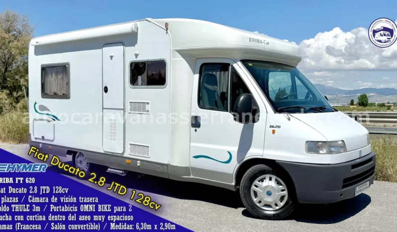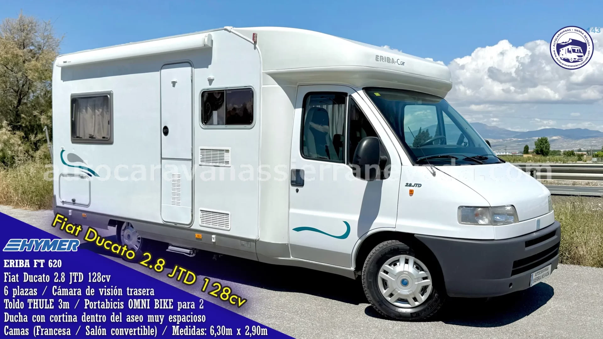 Autocaravana Perfilada Hymer, modelo ERIBA FT 620. La mejor marca del mercado y pionera en este tipo de construcciones, con terminaciones y acabados de máxima calidad muy propios de esta marca alemana. Del Año 2002 con 140.000km. Con un Motor Fiat Ducato 2.8 JTD 128cv , muy potente y de fácil mantenimiento. Con 6 plazas homologadas para viajar y 4 para dormir. Una autocaravana muy amplia con Cama Francesa y salón convertible en cama. Consta de un garaje con unas medidas: (1,30 largo x 1,90 ancho x 0,55 alto) Una autocaravana espaciosa en su interior a pesar de no tener unas medidas excesivamente grandes. Ideal para gente que quiere una autocaravana muy cómoda de llevar y entrar en aparcamientos reducidos, se conduce igual que un turismo (6,60m x 2,90m).