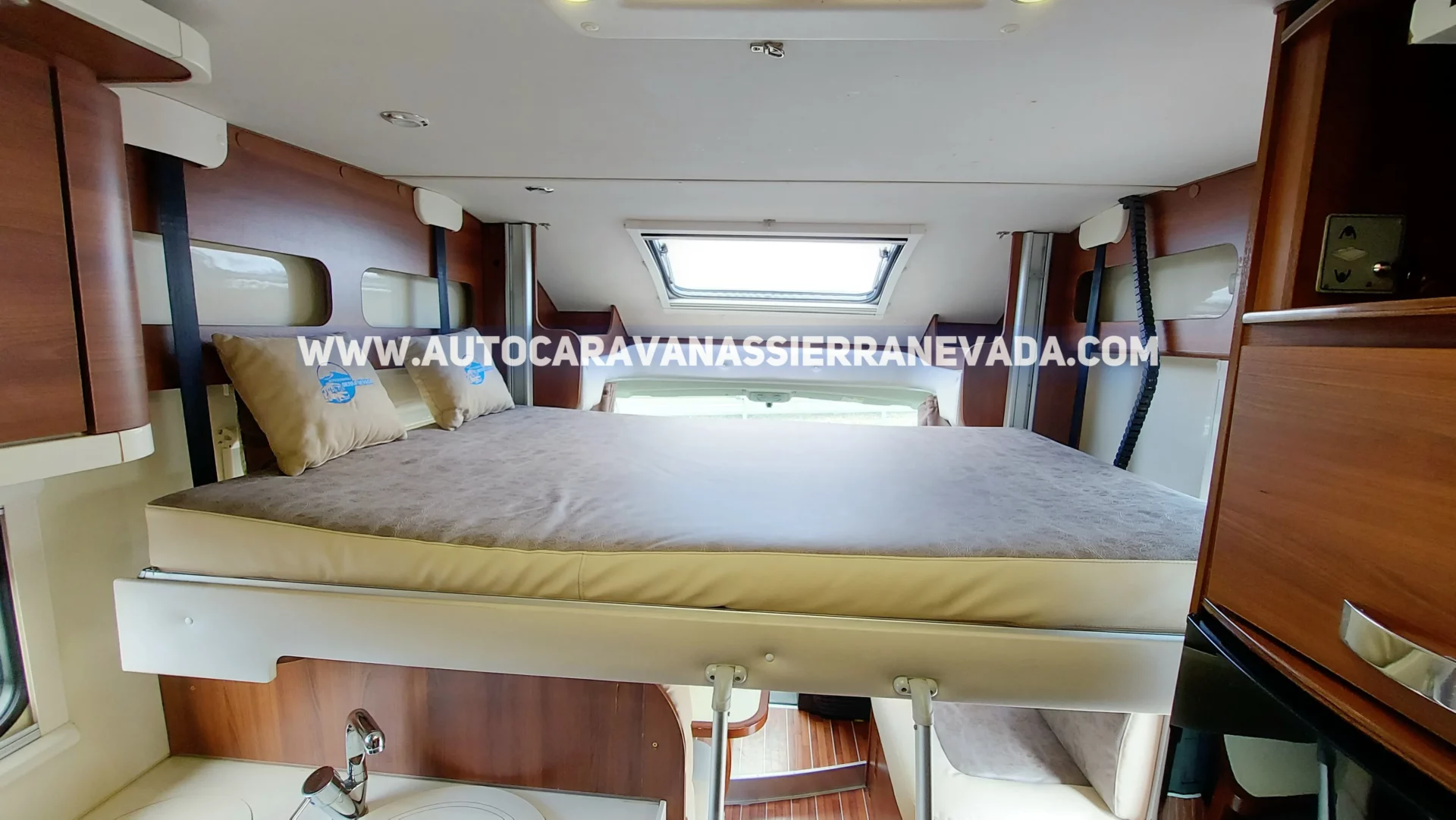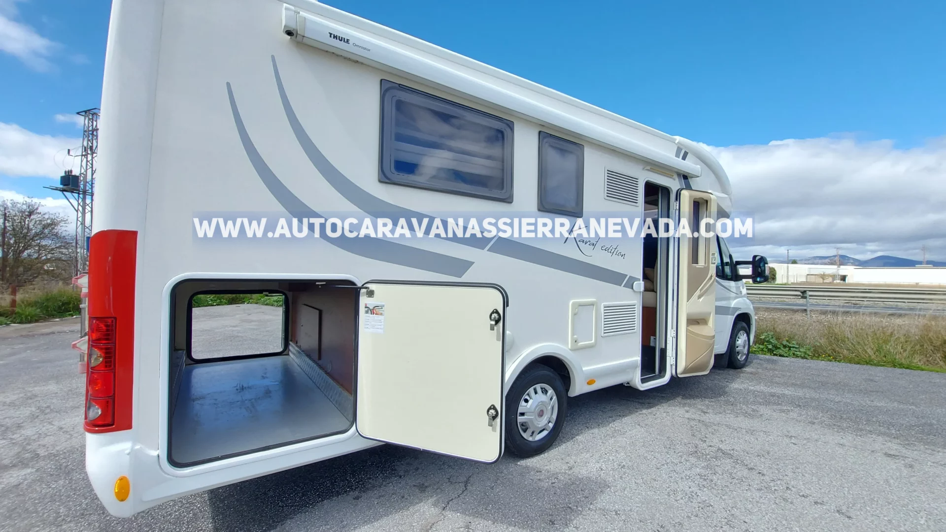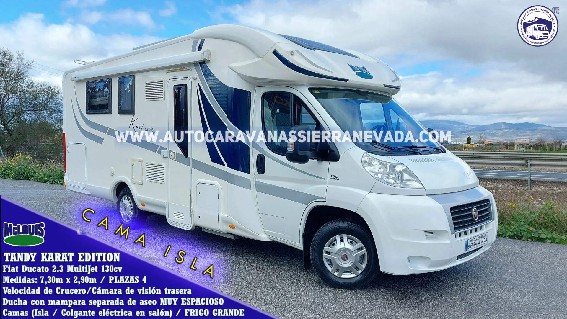 Autocaravana Perfilada de la marca McLouis, TANDY KARAT EDITION. Una de las marcas más valoradas por su dureza en su construcción, durabilidad, comodidad y seguridad. Este vehículo consta de una claraboya panorámica muy amplia en cabina, por donde entra mucha claridad dándole una sensación de amplitud y mucha ventilación .Del año 2013 con 86.000km, con documentación los certifica. Con motor Fiat Ducato 2.3 MultiJet 130cv 6 velocidades. Un motor moderno, muy fiable y de mantenimiento sencillo. Con 4 plazas homologadas en documentación para viajar y dormir gracias a sus siguientes camas: Colgante eléctrica en Salón + Isla en la parte trasera este tipo de cama también le proporciona una gran comodidad en todos los aspectos, tanto al hacerla como acostarse por ambos lados e incluso no molestar al otro al levantarse, además de conseguir un diseño muy selecto y cotizado en su interior .Con un Garaje espacioso doble portón, sus medidas son: (2,20 largo x 0,95 ancho x 0,80alto). Un vehículo muy bien distribuido y espacioso, perfecta para hacer viajes de larga estancia y vivir en ella, sus medidas: (7,30m x 2,90m).