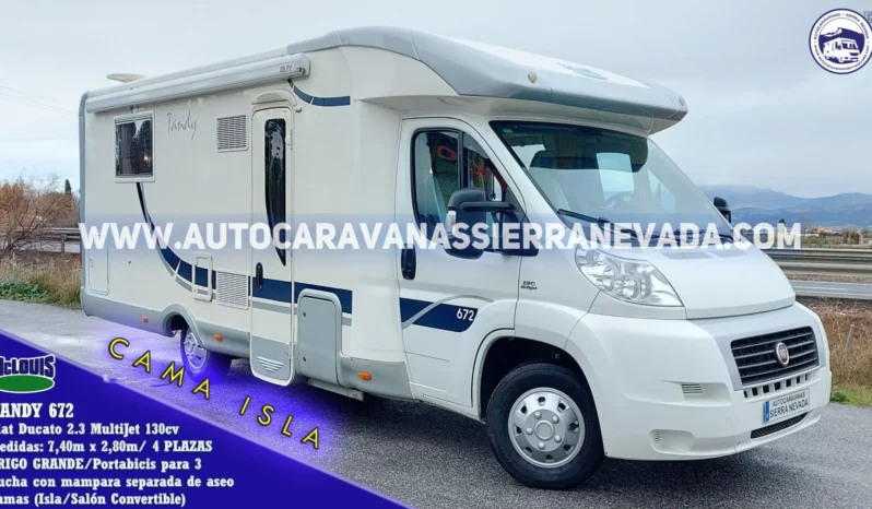 Autocaravana Perfilada de la marca McLouis, modelo Tandy 672. Una de las marcas más valoradas por su diseño y dureza en su construcción. Similar a Hymer, Niesmann, Bürstner o Euramobil, entre otras. Del año 2008 con 73.000km con toda la documentación que lo certifica. Con motor Fiat Ducato 2.3 MultiJet 130cv 6 velocidades. Un motor moderno, muy duro y de mantenimiento sencillo. Dispone de un TURBOVENT en la zona de la cocina. Con 4 plazas homologadas en documentación para viajar y dormir gracias a sus siguientes camas: Isla el modelo de cama más solicitado por todas las ventajas y comodidades que conlleva, y un extra más que añadir es el garaje tan amplio del que consta + salón convertible. Medida del Maletero: (2,20largo x 0,70ancho x 0,65 alto). Gracias a su interior tan amplio, esta increíble autocaravana es ideal para hacer grandes viajes dadas sus medidas: (7,40m x 2,80m).