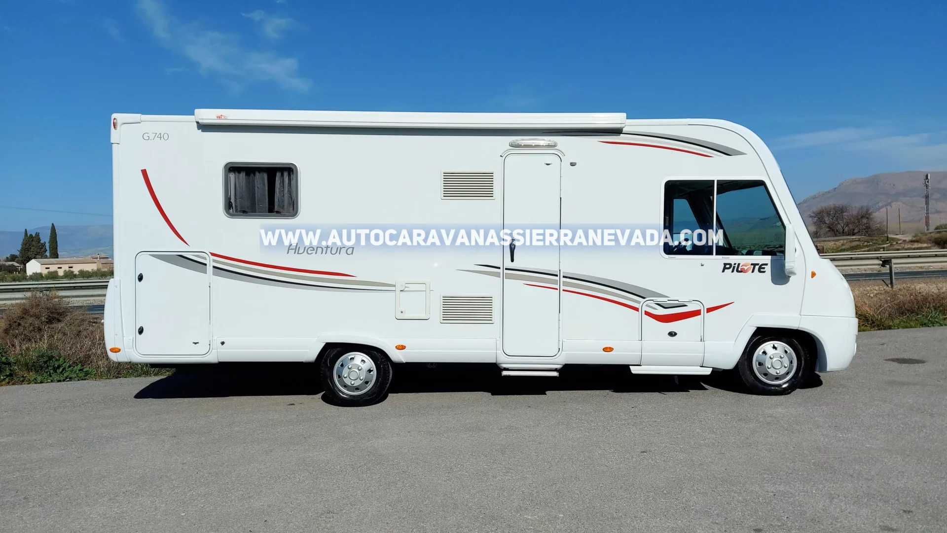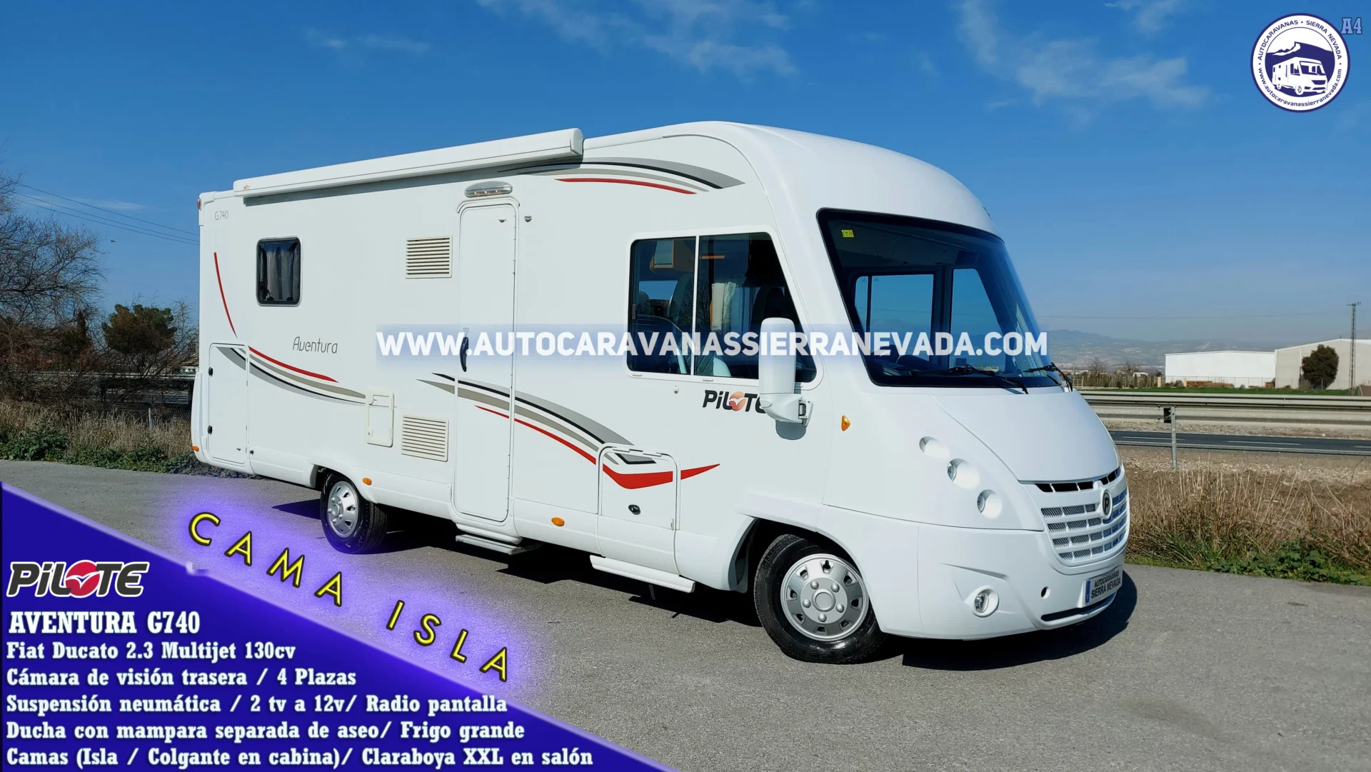 Autocaravana Integral  PILOTE, modelo AVENTURA G740., esta marca está situada en el  mercado entre una de las mejores de Europa, un vehículo de extrema calidad, perfecta para vivir en ella, aportando un gran aislamiento para climas tanto fríos como de mucho calor. Con un diseño moderno, con acabados y muebles de alta calidad. Este modelo aparte de tener unos acabados y muebles de gran calidad, es el más solicitado por nuestros clientes, ya que cuenta con *Cama isla para dos personas y busca su comodidad tanto al hacerla como acostarse por ambos lados. Del año 2011 con 52.000km, con un Motor Fiat Ducato 2.3 MultiJet 130cv y 6 velocidades, muy duro y de fácil mantenimiento. Con Suspensión Neumática. Con 4 plazas homologadas para viajar y dormir gracias a sus camas dobles (Cama isla ya mencionada y colgante en cabina). Cuenta con una distribución muy conseguida y muy amplia gracias a sus Medidas: (7,40m x 2,90m) ideal para grandes viajes y lo mejor de todo, se conduce con carnet B (el normal).Con un gran maletero doble portón sus medidas: (2,25m x 1,00m x 1,00m).