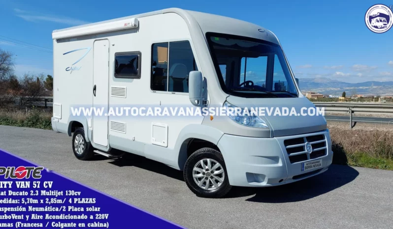 Autocaravana Integral PILOTE, modelo CITY VAN CV 57, esta marca está situada en el mercado entre una de las mejores de Europa, similar a Hymer, Burstner o Dethleffs entre otras. Año 2009 con 89.000km.Con Suspensión Neumática Motor Fiat Ducato 2.3 Multijet 130cv, 6 velocidades muy duro y de fácil mantenimiento. Con 4 plazas homologadas para viajar y dormir gracias a sus dos camas dobles: colgante sobre la cabina y Francesa en la parte trasera .Dispone de un TuboVent y aire acondicionado a 220v. Un vehículo muy amplio y bien distribuido a pesar de no tener unas medidas demasiado grandes. Ideal para alguien que va a iniciarse y/o quiere circular por sitios con limitación de espacio .Como una camper pero con las ventajas de una integral, sus medidas, (5,70m x 2,85m). Con un amplio maletero garaje, sus medidas: (1,32m x 1,30m x 0,60m).