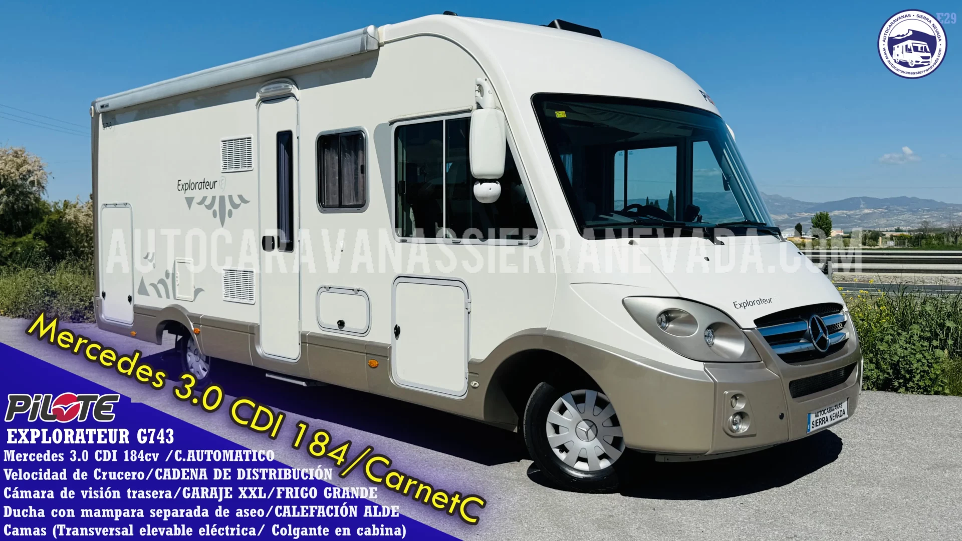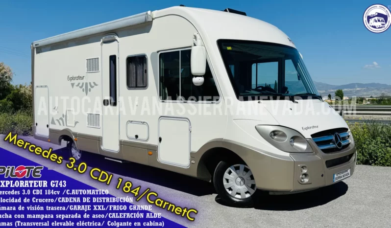 Autocaravana Integral PILOTE, modelo EXPLORATEUR G743, esta marca, está situada en el mercado entre una de las mejores de Europa, similar a Hymer, Burstner o Dethleffs entre otras, un vehículo de extrema calidad, perfecta para vivir en ella, aportando un gran aislamiento para climas tanto fríos como de mucho calor. La calefacción y el agua caliente funcionan mediante la caldera ALDE, insonora y de radiadores como en casa. Año 2011 con 84.000km y procedente de particular. Motor Motor Mercedes 3.0 CDI 184cv AUTOMATICA, con Cadena de distribución, super potente, robusto, fiable. Dispone de 4 plazas homologadas para viajar y dormir gracias a sus dos camas dobles, cama Transversal elevable eléctrica en la parte trasera y Colgante en Cabina. Gran garaje con doble portón, sus medidas son: (2,20m x 1,00m x 1,25m) donde podrá llevar moto scooter o varias bicicletas. Perfecta para hacer largos viajes o vivir en ella gracias a sus medidas: (7,40m x 3,00m). Este vehículo se conduce con CARNET C. y su M.M.A 3.880kg la mayor ventaja es su capacidad de carga.