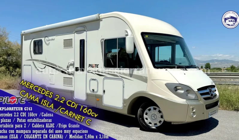 Autocaravana Integral PILOTE, modelo EXPLORATEUR G743, esta marca, está situada en el mercado entre una de las mejores de Europa, similar a Hymer, Burstner o Dethleffs entre otras, un vehículo de extrema calidad, perfecta para vivir en ella, aportando un gran aislamiento para climas tanto fríos como de mucho calor. Año 2010 con 74.000km y procedente de particular. Motor MERCEDES 2.2 CDI 160cv, super potente, robusto y fiable.Concadena de distribución (no lleva correa). La calefacción y el agua caliente funcionan mediante  caldera ALDE, insonora y de radiadores como en casa. Dispone de 4 plazas homologadas para viajar y 4para dormir ya que dispone de una amplia cama Isla este tipo de cama también le proporciona una gran comodidad en todos los aspectos, tanto al hacerla como acostarse por ambos lados e incluso no molestar al otro al levantarse, además de conseguir un diseño muy selecto y cotizado en su interior en la parte trasera y una Colgante en cabina. Gran garaje con doble portón, sus medidas son: (2,20m x 0,90m x 0,80m).Perfecta para hacer largos viajes o vivir en ella gracias a sus medidas: (7,40m x 3,10m). Este vehículo se conduce con CARNET C. y su M.M.A 3.880kg la mayor ventaja es su capacidad de carga