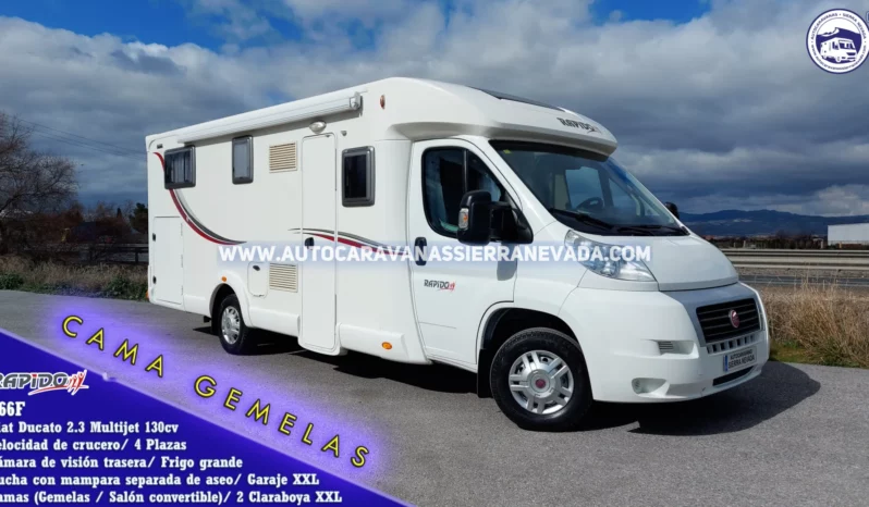 Autocaravana Perfilada RAPIDO, modelo 666F, una de las marcas más valoradas del mercado por sus terminaciones, diseño y dureza en su construcción, similar a Hymer, Burstner o Euramobil entre otras. Motor Fiat Ducato 2.3 Multijet 130cv y 6 velocidades, un motor muy duro y de fácil mantenimiento. Año 2012 con 109.000km. Dispone de 4 plazas homologadas para viajar y dormir gracias a sus camas: Camas Gemelas en la parte tasera con posibilidad de ampliar y hacer una cama transversal gigante y Salón Convertible. Una autocaravana muy amplia, perfecta para hacer viajes de larga estancia y vivir en ella, sus medidas: (7,40m x 2,80m). Medidas de maletero doble portón: (2,15m x 1,10m x 1,20m).